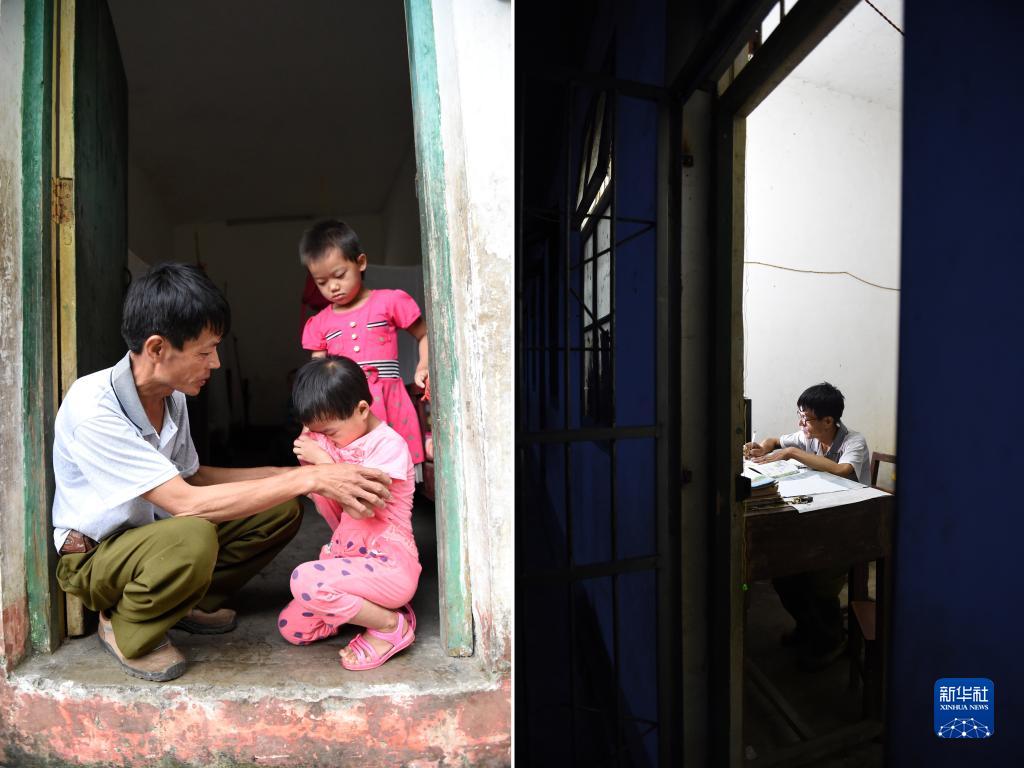 拼版照片:廣西東蘭縣三石鎮泗爺小學(xué)的黃英雄老師在安慰一名因想家而哭泣的寄宿生(左圖),黃英雄老師在備課(右圖)(2014年9月10日攝)。2014年,時(shí)年50歲的黃英雄老師已在大山里工作28個(gè)年頭,泗爺小學(xué)當時(shí)有學(xué)生31名,分3個(gè)教學(xué)班,教師只有黃英雄一個(gè)人。