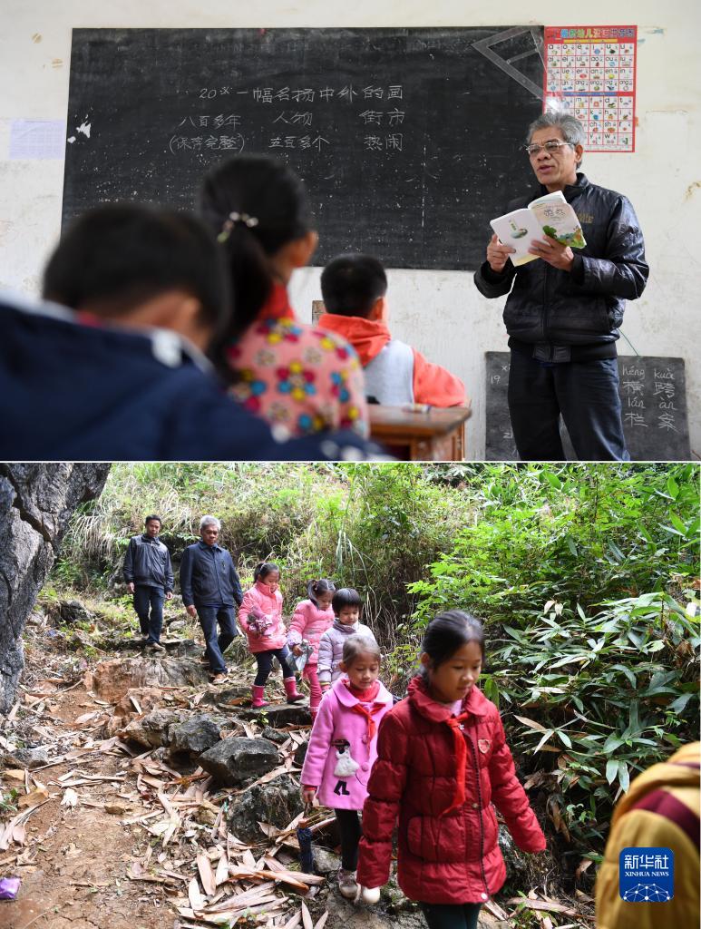 拼版照片:廣西大新縣寶圩鄉那排教學(xué)點(diǎn)的覃誠老師給學(xué)生上課(上圖),覃誠老師(左二)和同事覃永忠老師(左一)陪學(xué)生走山路回家(下圖)(2017年11月24日攝)。時(shí)年54歲的覃誠在邊境學(xué)校工作已經(jīng)26年。因患上視網(wǎng)膜血管炎,左眼視力為0.3,右眼視力僅為0.01,但為了學(xué)生課程不落下,他堅持每天吃藥帶病上課。