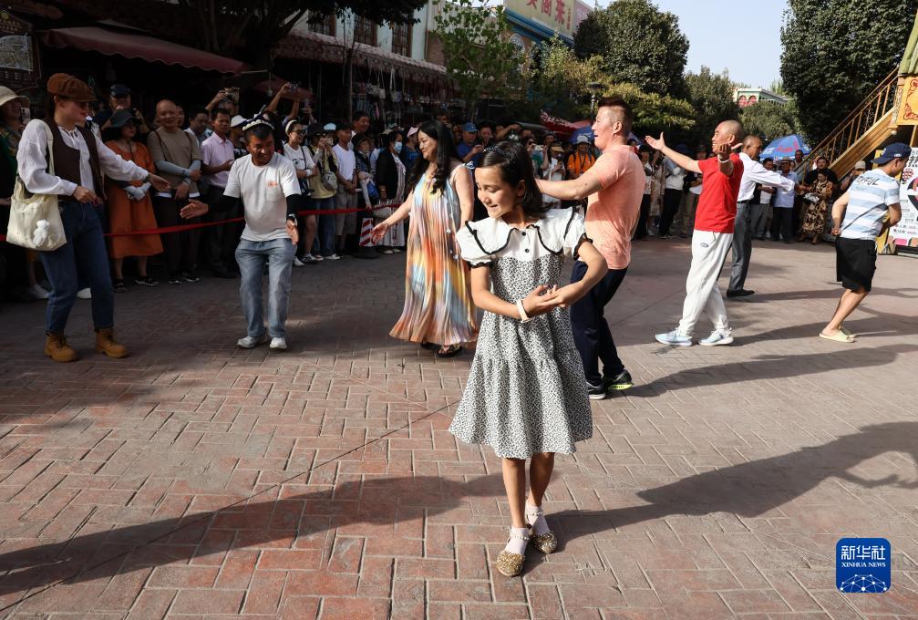 在新疆喀什古城景區內,當地居民和游客在隨音樂(lè )起舞(9月7日攝)。