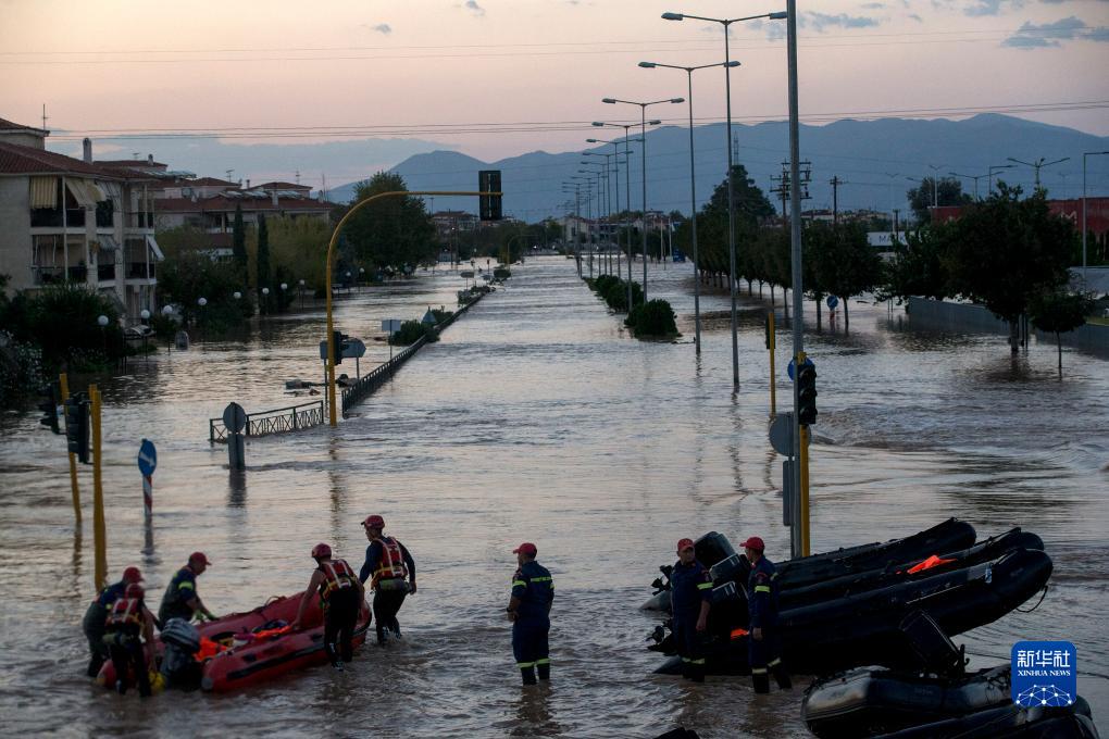 9月10日,在希臘中部色薩利地區,救援人員使用橡皮艇參與救援。