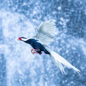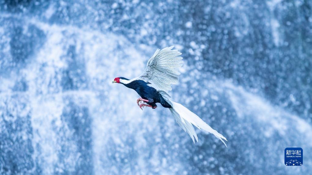 9月9日,一只白鷴從瀑布前飛過(guò)。