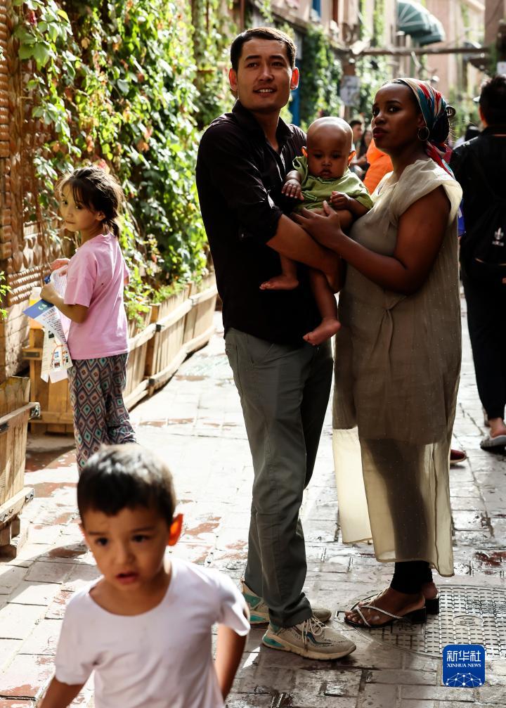 迪力夏提抱著(zhù)孩子和海迪雅走在喀什古城景區的巷道內(9月7日攝)。
