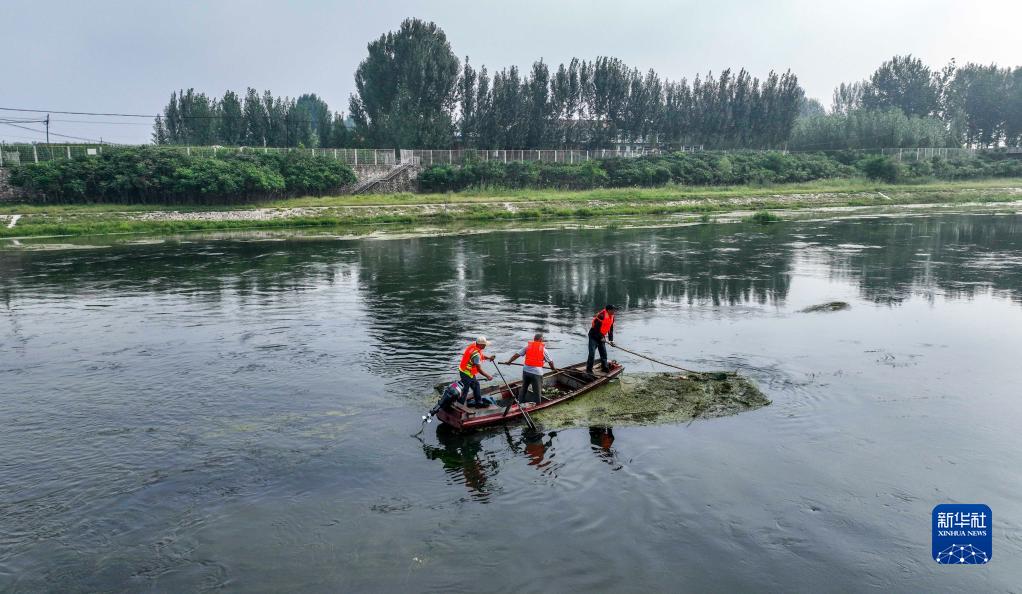 9月11日,工作人員在引灤入津工程重要輸水河道河北省遵化市黎河打撈漂浮物(無(wú)人機照片)。