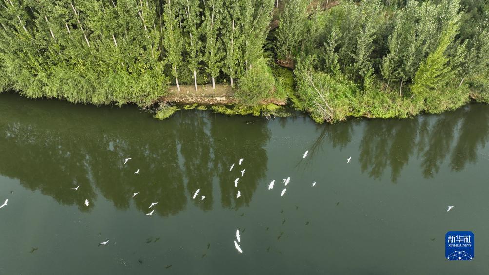 在河北省遵化市,一群白鷺在引灤入津工程重要輸水河道黎河上空飛翔(9月11日攝,無(wú)人機照片)。