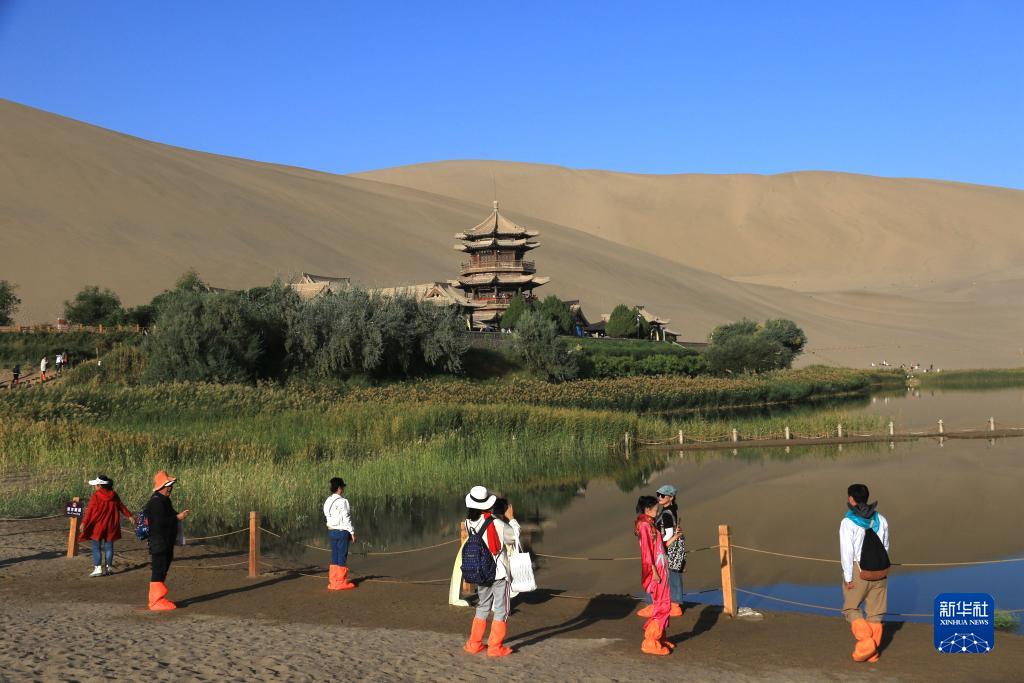9月11日,游客在甘肅省敦煌市鳴沙山月牙泉景區游覽。