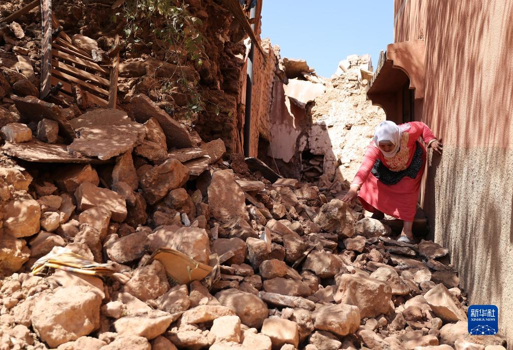9月11日,在摩洛哥馬拉喀什南部的穆萊村,一名婦女走過(guò)地震廢墟。