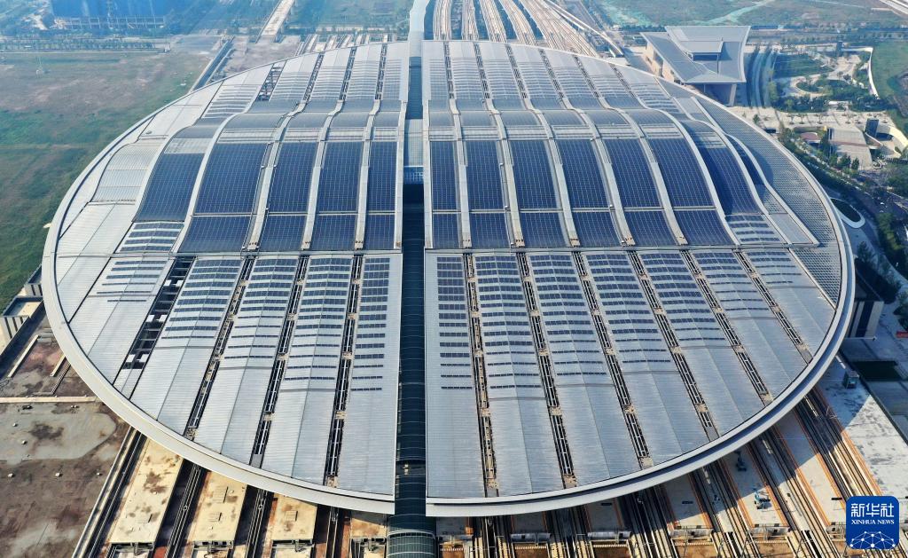 京雄城際鐵路雄安站站頂分布式光伏電站(2022年9月9日攝,無(wú)人機照片)。