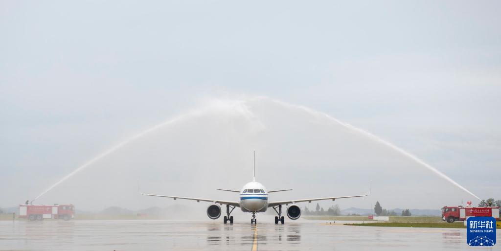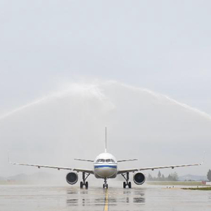 9月12日,在四川省閬中市閬中古城機場(chǎng),國航空客A319飛機通過(guò)“水門(mén)”。