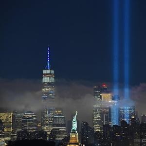 9月11日晚,美國紐約世貿中心遺址附近亮起象征紐約世貿中心“雙子塔”大廈的光柱,紀念“9·11”恐怖襲擊事件二十二周年。
