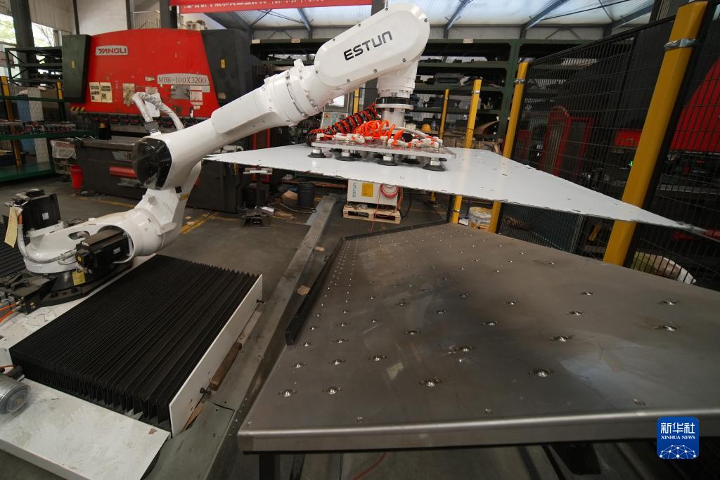 9月12日,機器人在滄州惠邦機電產(chǎn)品制造有限公司生產(chǎn)車(chē)間加工機箱部件。
