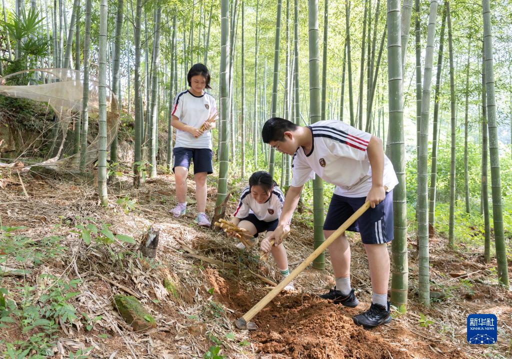 9月12日,浙江省諸暨市學(xué)勉中學(xué)的學(xué)生在竹園挖筍。