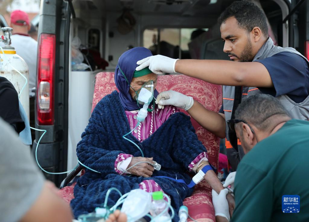 9月12日,在震中區域的摩洛哥豪茲省塔拉特恩雅庫布村,救援人員救治一名受傷的老人。