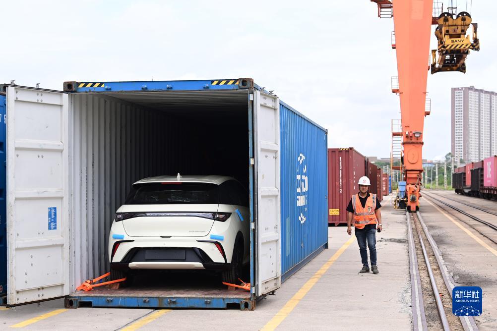 9月13日,在江西贛州國際陸港,新能源汽車(chē)已裝運至集裝箱內。