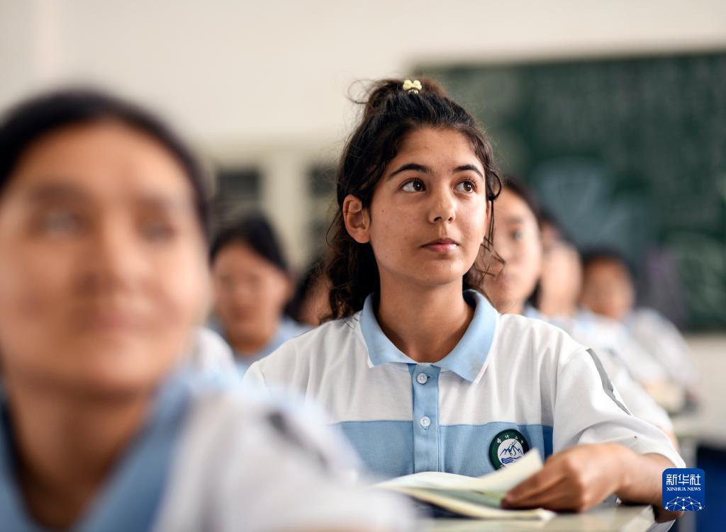 9月7日,在新疆喀什第二中學(xué),拉齊尼的女兒都爾汗·拉齊尼在課堂上認真聽(tīng)講。新華社記者 王菲 攝