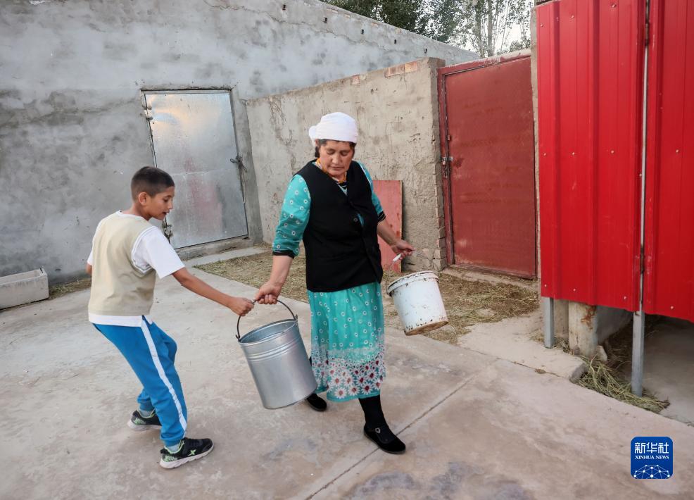 9月5日,巴依卡老人的小兒子熱飛·巴依卡要替媽媽拿較重的牛奶桶。新華社記者 蘭紅光 攝