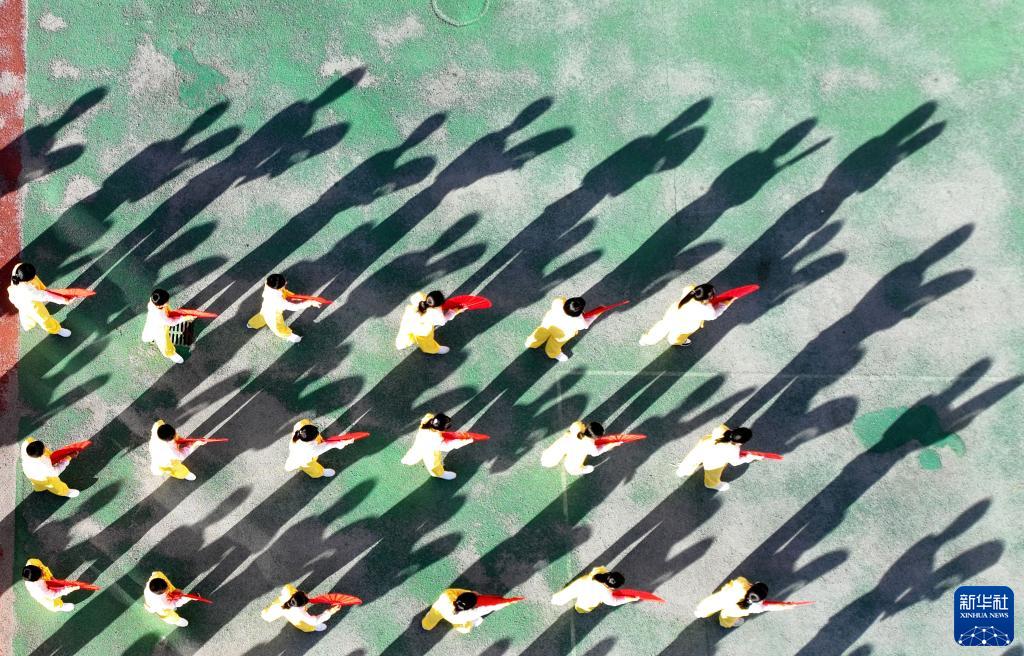 9月13日,在承德市雙橋區會(huì )龍山小學(xué),學(xué)生練習太極扇(無(wú)人機照片)。