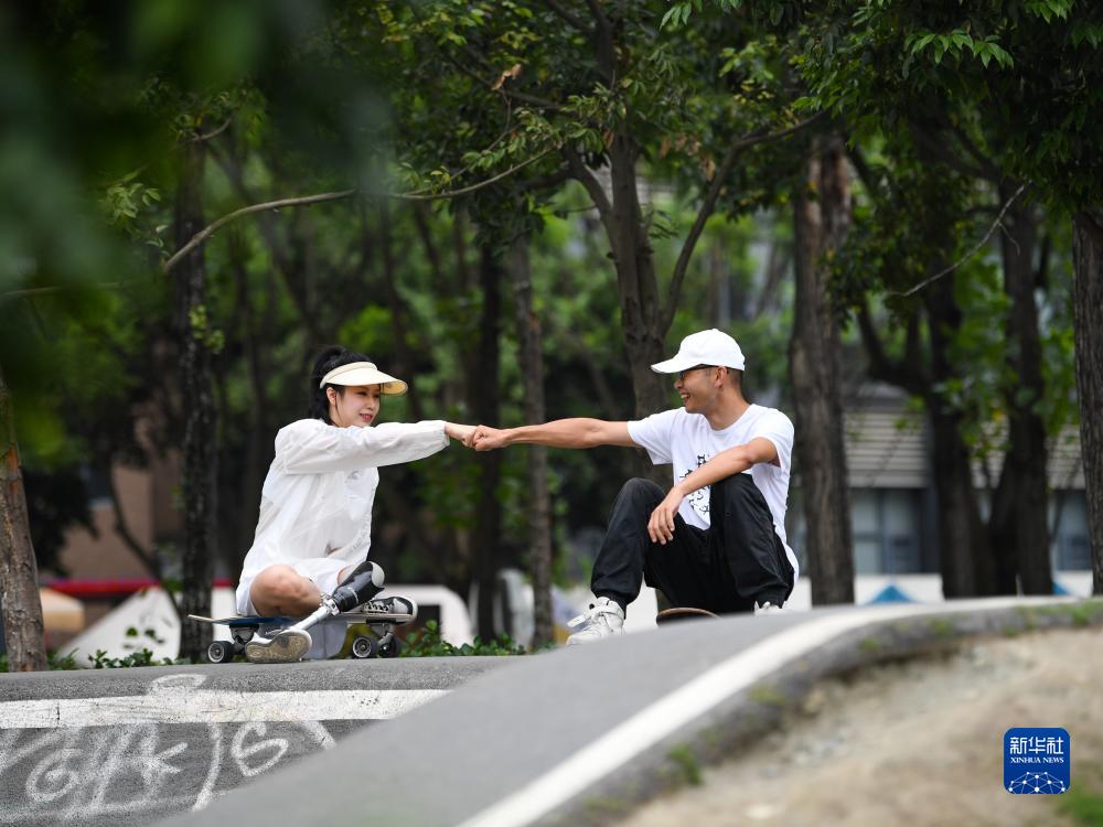 在成都市錦江區輕極限運動(dòng)公園,胡月(左)和滑板愛(ài)好者在交流(6月20日攝)。新華社記者 王曦 攝