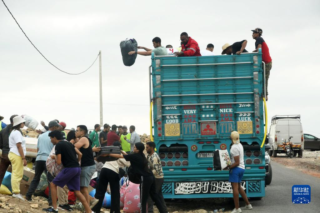 9月12日,救援人員在摩洛哥豪茲省的穆萊村搬運物資。