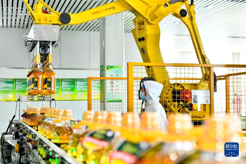 9月13日,在長(cháng)壽花食品股份有限公司,工業(yè)機器人在抓取玉米油。