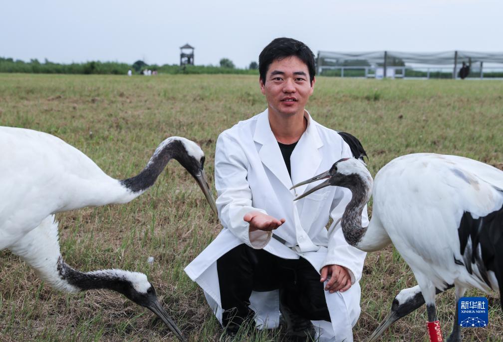 姜官宏在野化訓養丹頂鶴(2023年8月21日攝)。姜官宏在江蘇鹽城國家級珍禽自然保護區管理處下屬鳥(niǎo)類(lèi)研究中心從事丹頂鶴的人工孵化、人工育雛等工作。截至目前,他和團隊共育成丹頂鶴一百多只。新華社記者 楊磊 攝
