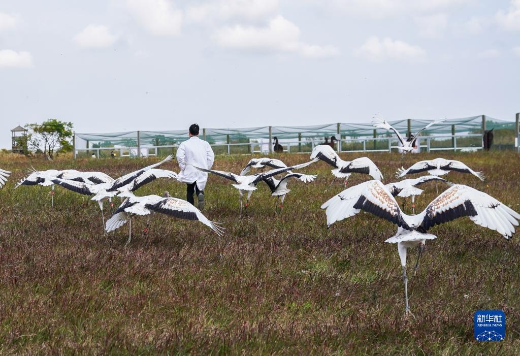 姜官宏對人工繁育的丹頂鶴進(jìn)行野外放飛訓練(2022年11月8日攝)。新華社記者 季春鵬 攝