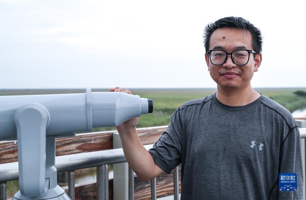 李征浩在觀(guān)鳥(niǎo)臺上(2023年8月21日攝)。2018年起,李征浩在江蘇鹽城國家級珍禽自然保護區管理處資源調查與監測科從事濕地生態(tài)和生物多樣性監測、退化濕地恢復等工作,鳥(niǎo)類(lèi)多樣性調查和監測是其中的重要工作內容?!氨Wo區地處偏僻、工作條件艱苦,但是因為熱愛(ài),所以堅持,我一入行就愛(ài)上了這個(gè)職業(yè),打算一直干下去?!蹦壳?,他作為主要發(fā)明人獲得授權濕地監測與保護的相關(guān)專(zhuān)利已有8項。新華社記者 楊磊 攝