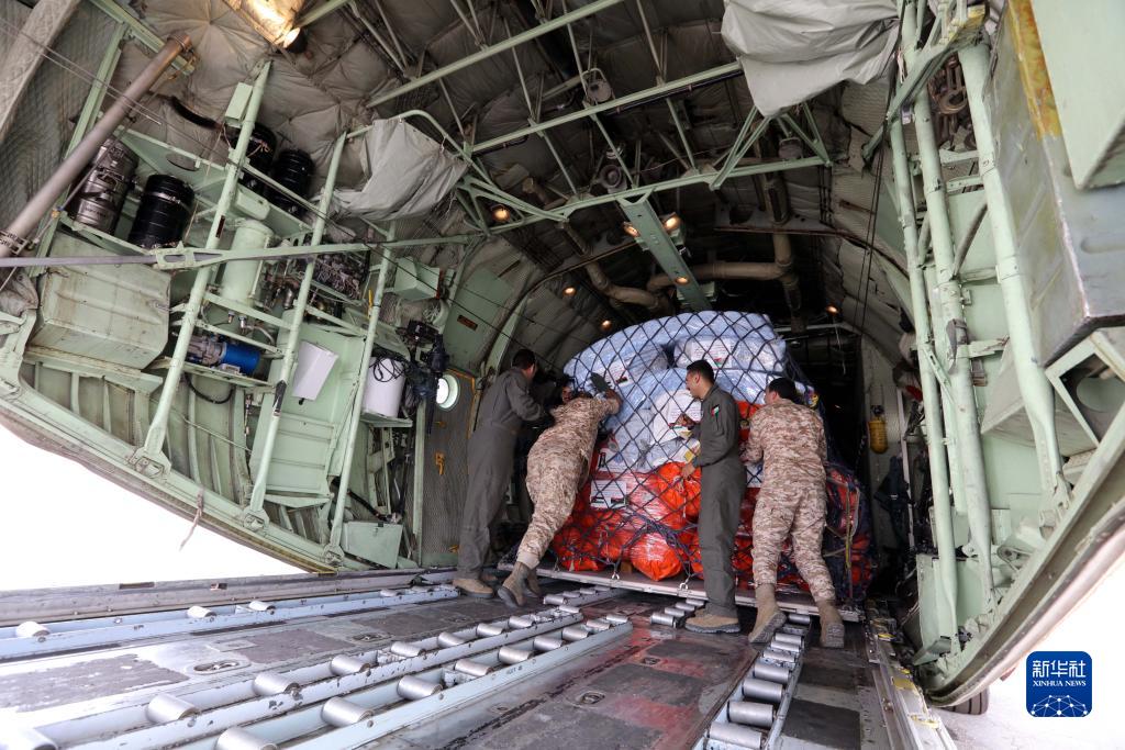 9月13日,工作人員在約旦安曼一軍用機場(chǎng)搬運援助物資。