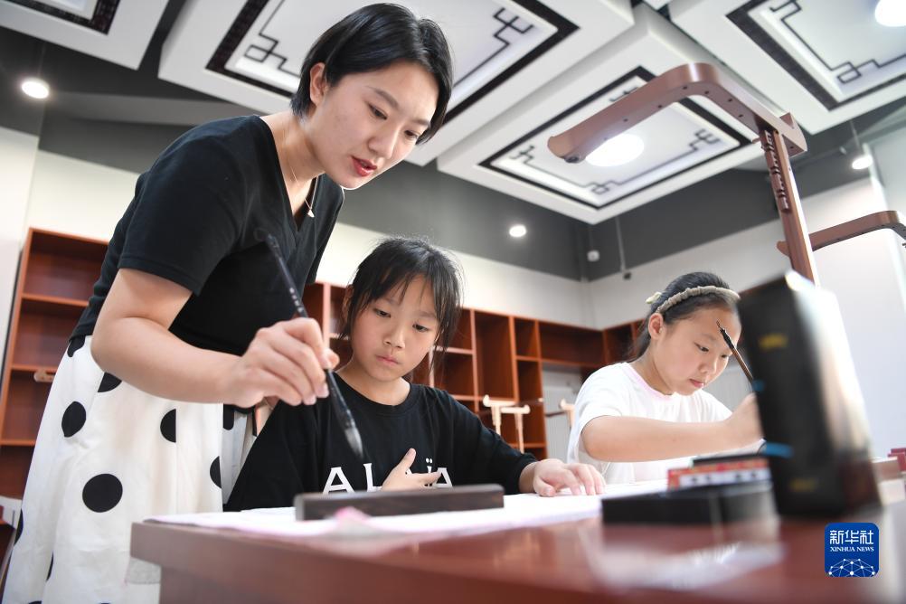 9月13日,雄安史家胡同小學(xué)書(shū)法老師指導學(xué)生練習書(shū)法。