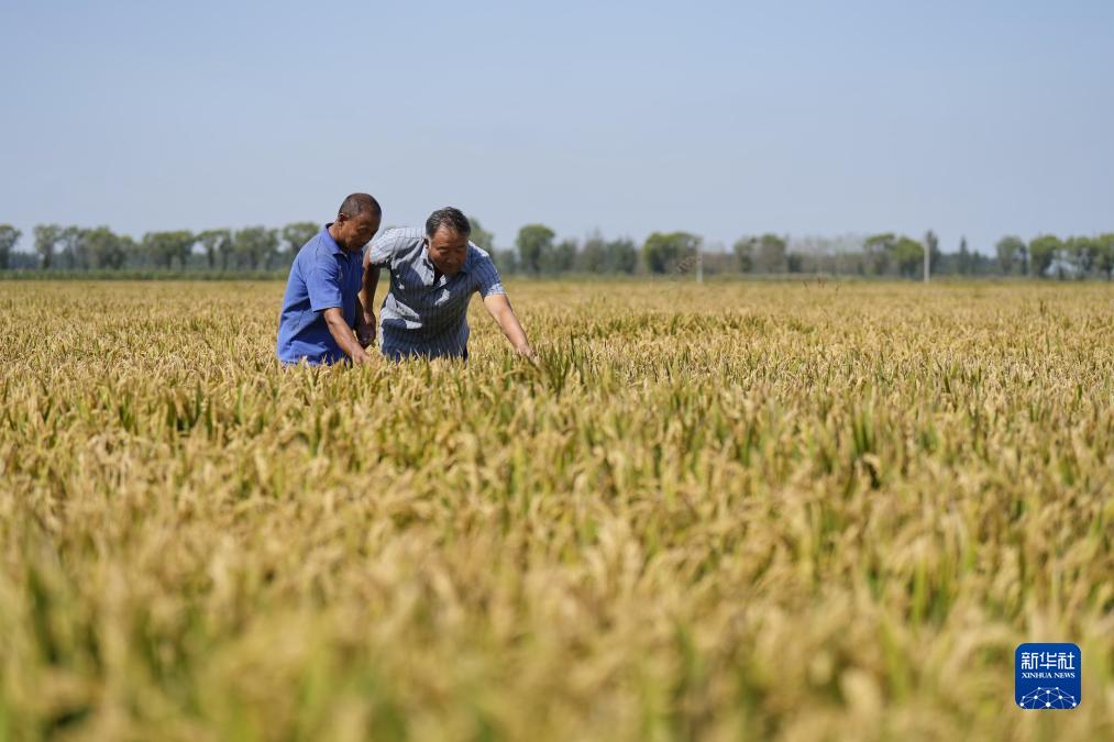 9月14日,河北省樂(lè )亭縣古河鄉農民在由鹽堿地改良而成的水稻田內查看水稻長(cháng)勢。