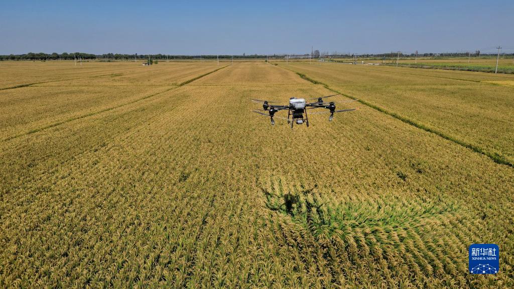 9月14日,在由鹽堿地改良而成的樂(lè )亭縣數字循環(huán)農業(yè)智慧園區,植保無(wú)人機在投放稻田蟹飼料。