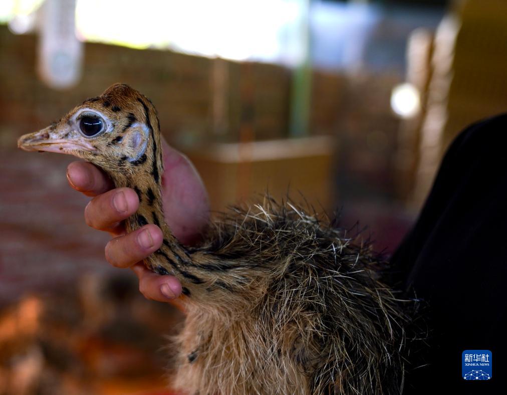 9月13日,吳錦彪安撫一只鴕鳥(niǎo)幼崽。新華社記者 胡晨歡 攝