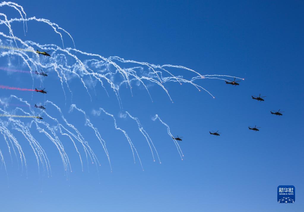 9月14日,在第六屆中國天津國際直升機博覽會(huì )開(kāi)幕式上,陸軍“風(fēng)雷”飛行表演隊進(jìn)行通場(chǎng)飛行表演。