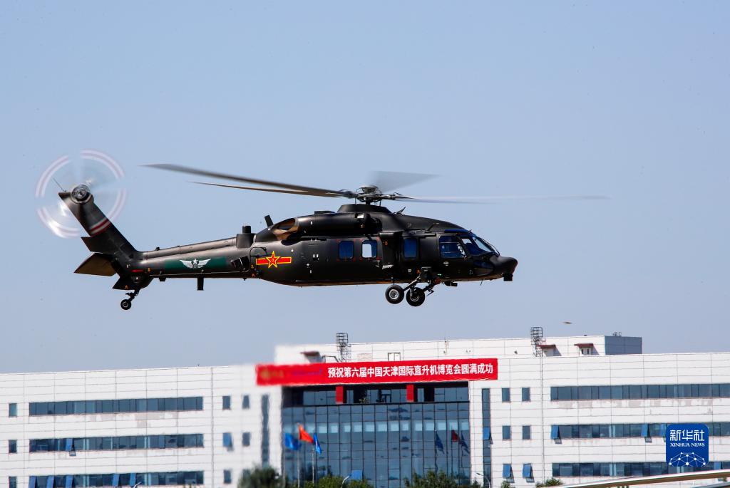 9月14日,在第六屆中國天津國際直升機博覽會(huì )開(kāi)幕式上,陸軍“風(fēng)雷”飛行表演隊直-20戰術(shù)通用直升機進(jìn)行飛行表演。