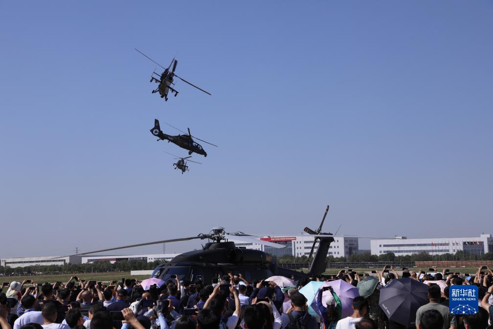 9月14日,在第六屆中國天津國際直升機博覽會(huì )開(kāi)幕式上,陸軍“風(fēng)雷”飛行表演隊直-19武裝直升機進(jìn)行飛行表演。