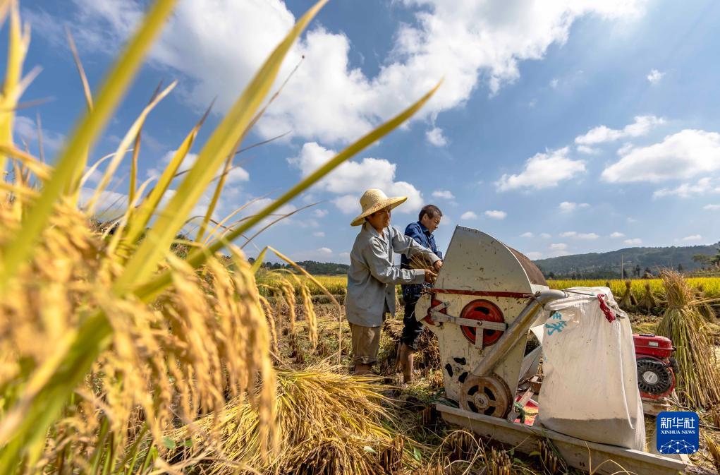 9月15日,村民在貴州省黔西市錦星鎮洪湖村收割稻谷。