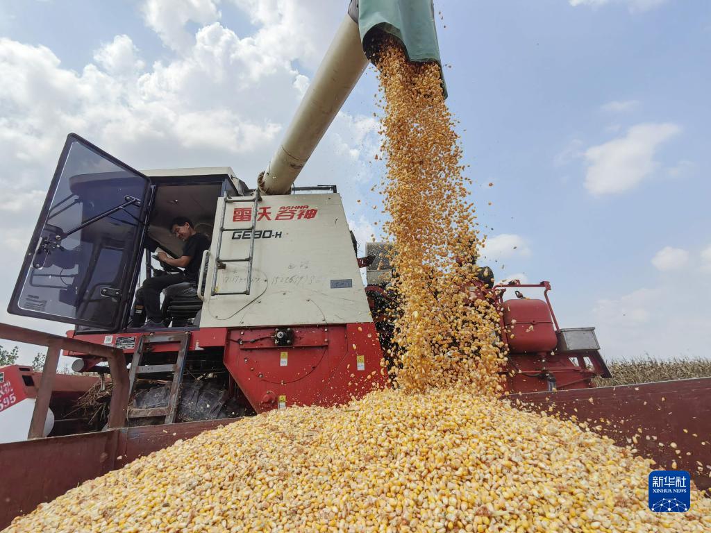 9月14日,農民駕駛農機在河南省駐馬店市汝南縣羅店鎮袁莊村收獲成熟的玉米。