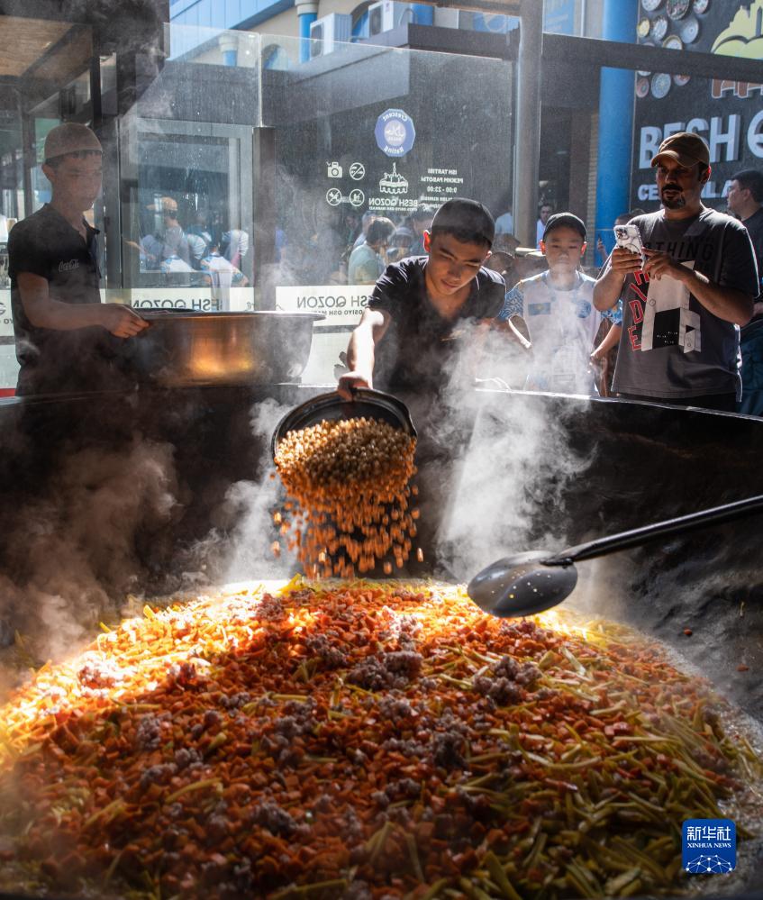 9月14日,在烏茲別克斯坦首都塔什干,工作人員制作抓飯。
