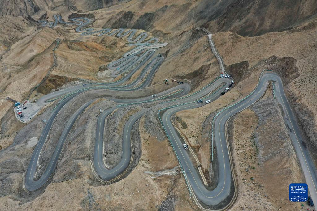 在新疆塔什庫爾干塔吉克自治縣,游客駕車(chē)穿行在“盤(pán)龍古道”景區(8月27日攝,無(wú)人機照片)。