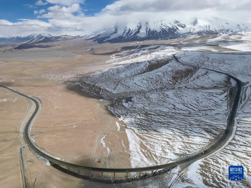 改擴建后314國道(也稱(chēng)中巴友誼公路)從慕士塔格峰腳下穿過(guò)(3月29日攝,無(wú)人機照片)。