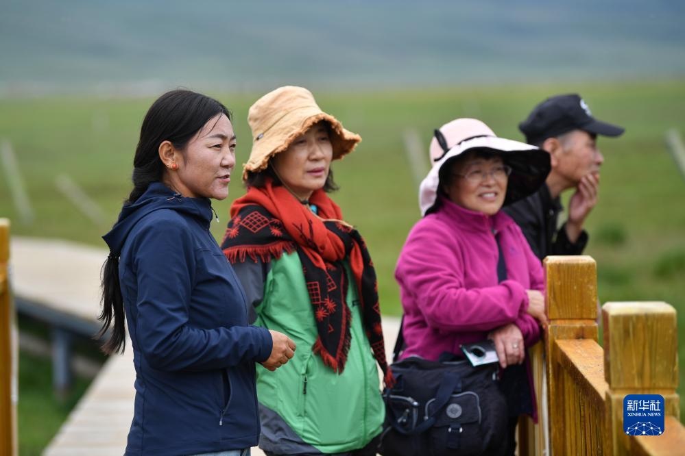 甘肅尕海則岔國家級自然保護區管護中心尕海保護站站長(cháng)香毛吉(左一)向游客介紹保護區的野生動(dòng)植物情況(7月7日攝)。