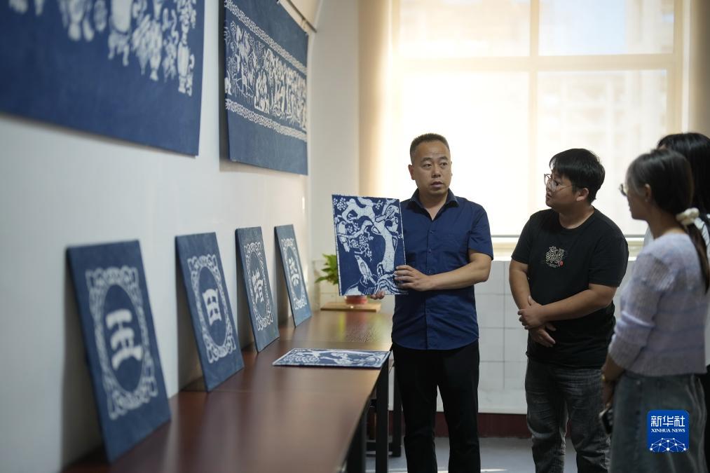 9月16日,玉田蠟染藝人在玉田縣“非遺會(huì )客廳”工作室內向參觀(guān)者介紹蠟染作品。