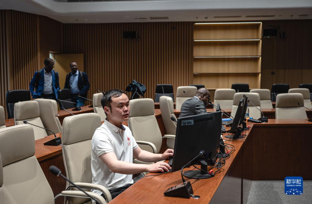 9月11日,中方技術(shù)服務(wù)組組長(cháng)楊宇杰在埃塞俄比亞首都亞的斯亞貝巴非洲疾控中心總部大樓內測試會(huì )議系統。