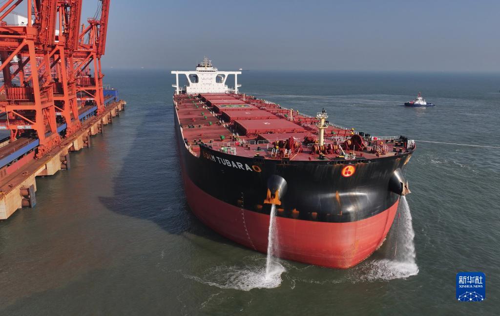 9月16日,一艘輪船駛離唐山港曹妃甸港區礦石碼頭(無(wú)人機照片)。