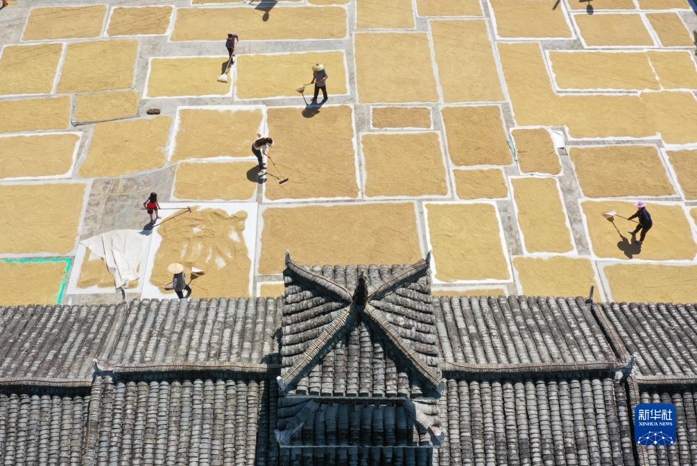 9月16日,村民在貴州省黔東南苗族侗族自治州從江縣剛邊壯族鄉三聯(lián)村晾曬稻谷(無(wú)人機照片)。