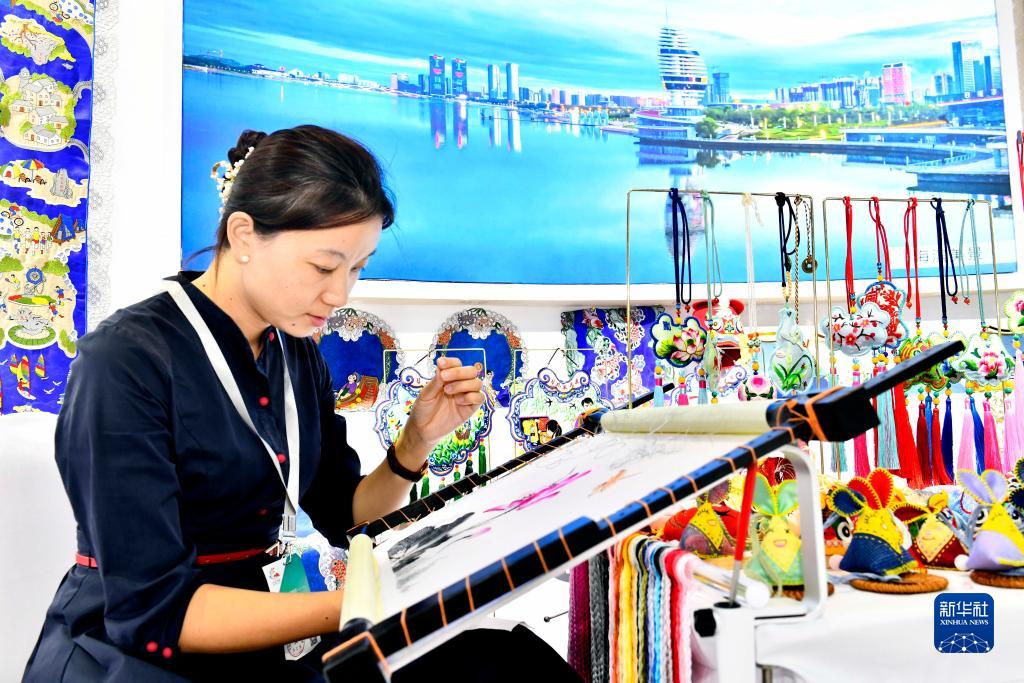 9月16日,在山東國際會(huì )展中心,日照市刺繡非遺傳承人李兆梅現場(chǎng)展示刺繡技藝。