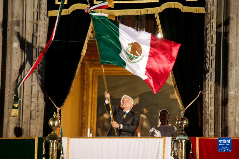 9月15日,在墨西哥首都墨西哥城的國家宮,墨西哥總統洛佩斯在慶祝墨西哥獨立213周年活動(dòng)上揮舞國旗。