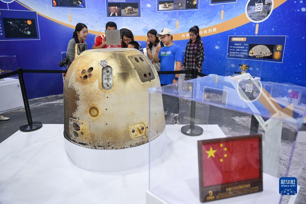 9月17日,在全國科普日北京主場(chǎng)活動(dòng)展區,參觀(guān)者參觀(guān)展出的嫦娥五號再入返回飛行試驗任務(wù)返回器。