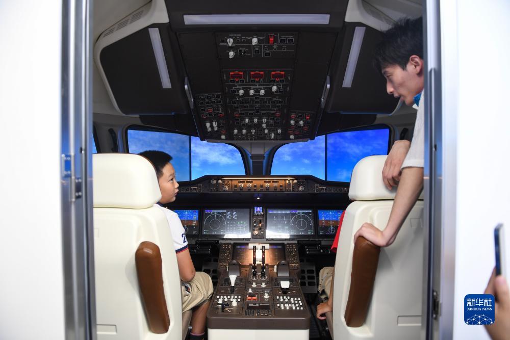 9月17日,在全國科普日北京主場(chǎng)活動(dòng)展區,兩名小朋友在體驗C919模擬駕駛器。