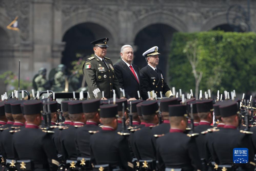 9月16日,墨西哥總統洛佩斯(中)在墨西哥首都墨西哥城出席獨立日閱兵式。