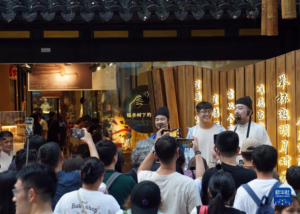 9月17日,在豫園商城,扮演李白、杜甫的演員邀請游客進(jìn)行對詩(shī)和猜謎等互動(dòng)游戲。